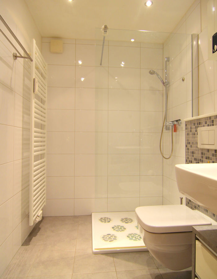 Das moderne Badezimmer verfügt über eine Dusche, ein Hänge-WC, ein Waschbecken, ein Handtuchheizkörper und Deckenspots.
