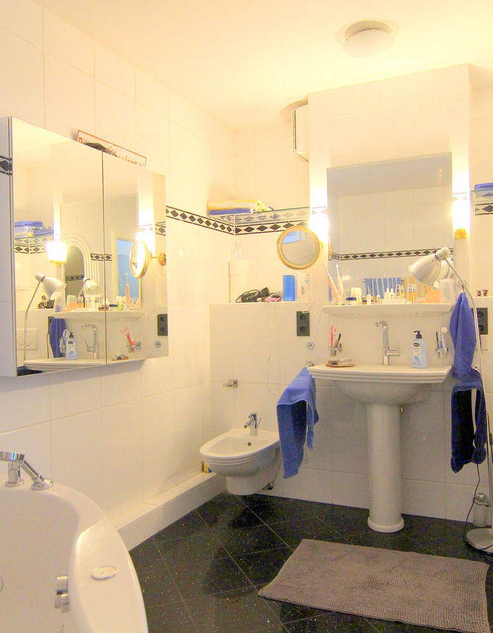 Das zweite Badezimmer verfügt über eine Badewanne und ist außerdem mit einem Hänge-WC, einem Bidet, einer Lüftung, einem Spiegelschrank, einem Waschbecken sowie einem Spiegel ausgestattet.