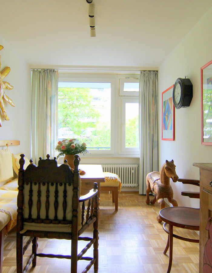 Der mit Parkettboden ausgelegte Flur führt Sie zum Gäste-WC, dem Arbeitszimmer, dem Gästezimmer sowie zu den beiden Badezimmern. Das Schlafzimmer ist nur über das Badezimmer mit Badewanne zugänglich.